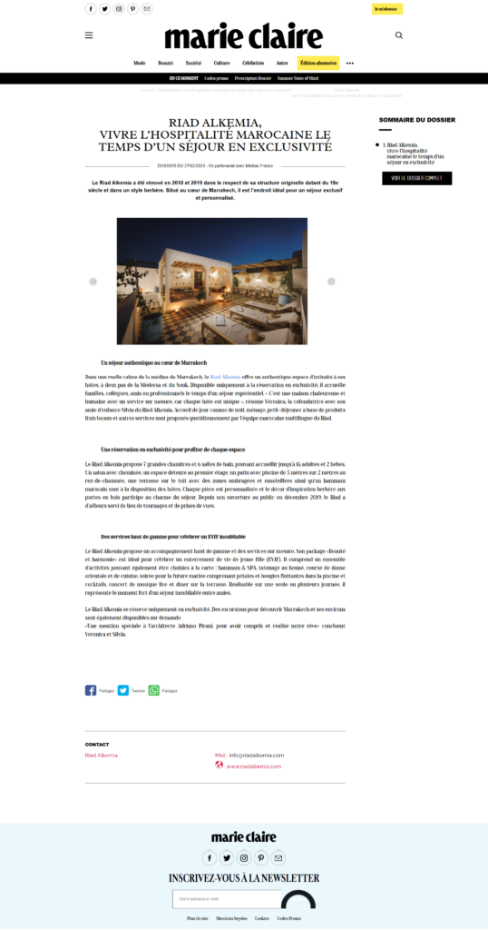 Want to read the original article in its entirety? Visit Marie Claire’s website: Riad Alkemia, vivre l’hospitalitĂ© marocaine le temps d’un sĂ©jour en exclusivitĂ©